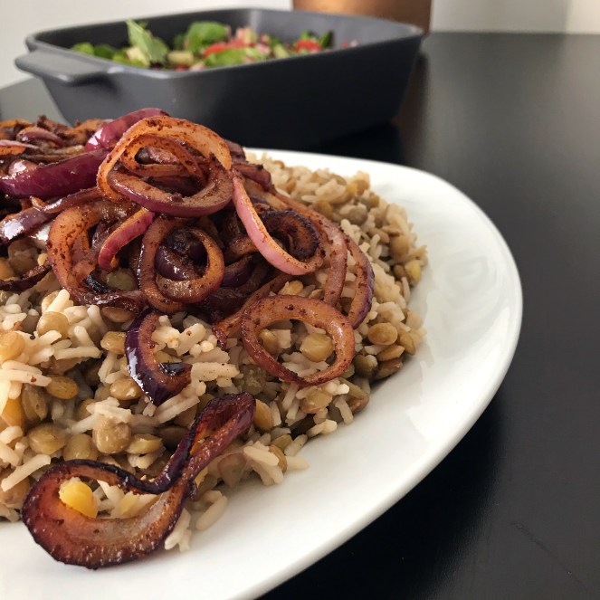Mujadara (tunnetaan myös nimillä mujadarra, mujadarah, majadra, mejadra, moujadara, mudardara, megadarrra alueesta riippuen) on Lähi-Idästä tuleva ruoka, joka yksinkertaisuudessaan sisältää linssiä, riisiä ja sipulia karamellisoituna. Valmistus on nopeaa ja vaivatonta, jonka vuoksi Mujadara sopii täydellisesti arkiruoaksi mutta myös juhlapöytään kun kylkeen valmistaa muutaman meze-annoksen tai raikkaan salaatin. Tarjoile Mujadara maustamattoman jogurtin kanssa ja lisää halutessasi päälle tuoreita yrttejä.