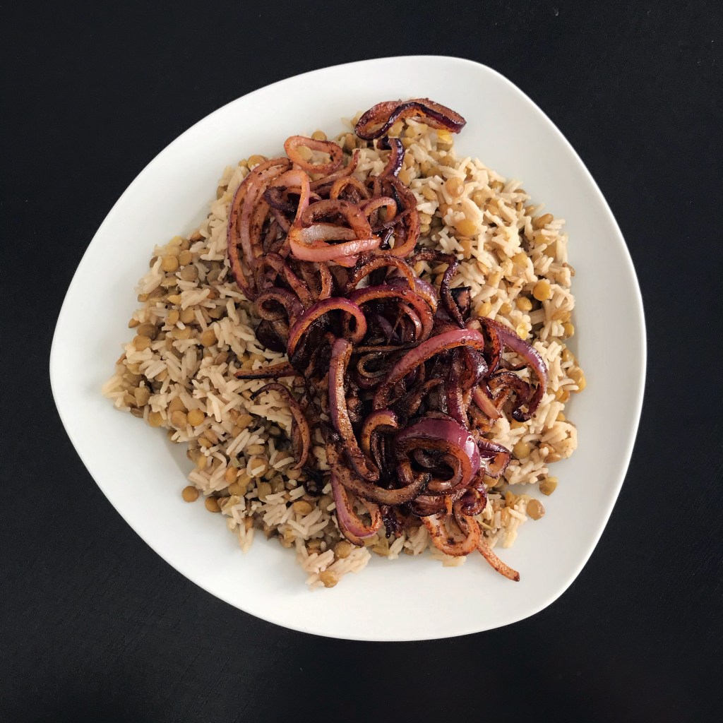 Kaada linssi-riisiseos laakealle tarjoiluastialle ja lisää karamellisoidut sipulit päälle.
