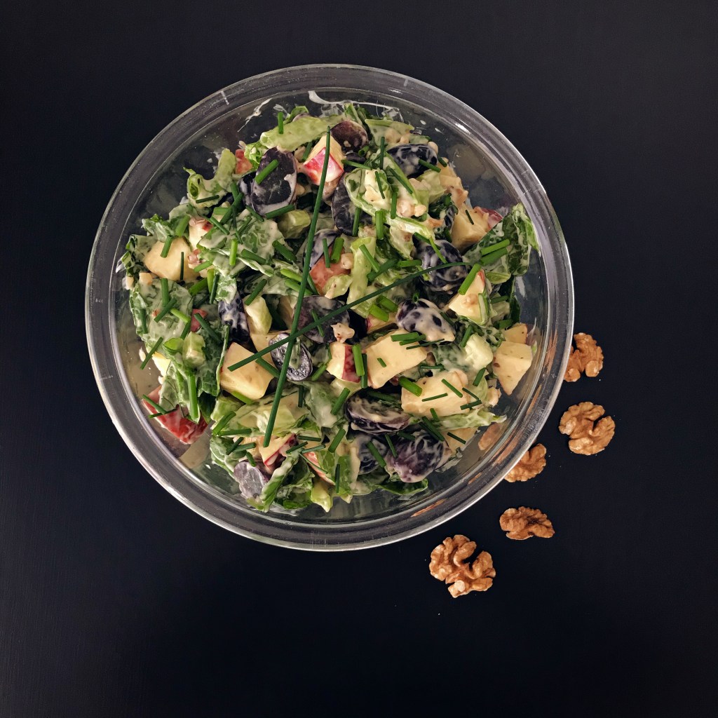 Murskaa saksanpähkinät rouheeksi ja paahda kuumalla pannulla noin viiden minuutin ajan. Sekoita keskenään omena, varsiselleri, viinirypäleet, paahdetut pähkinät, sitruunan mehu sekä majoneesi. Revi romainesalaatti joukkoon ja sekoita. Mausta salaatti halutessasi suolalla ja pippurilla ja anna maustua jääkaapissa noin 30 minuuttia.