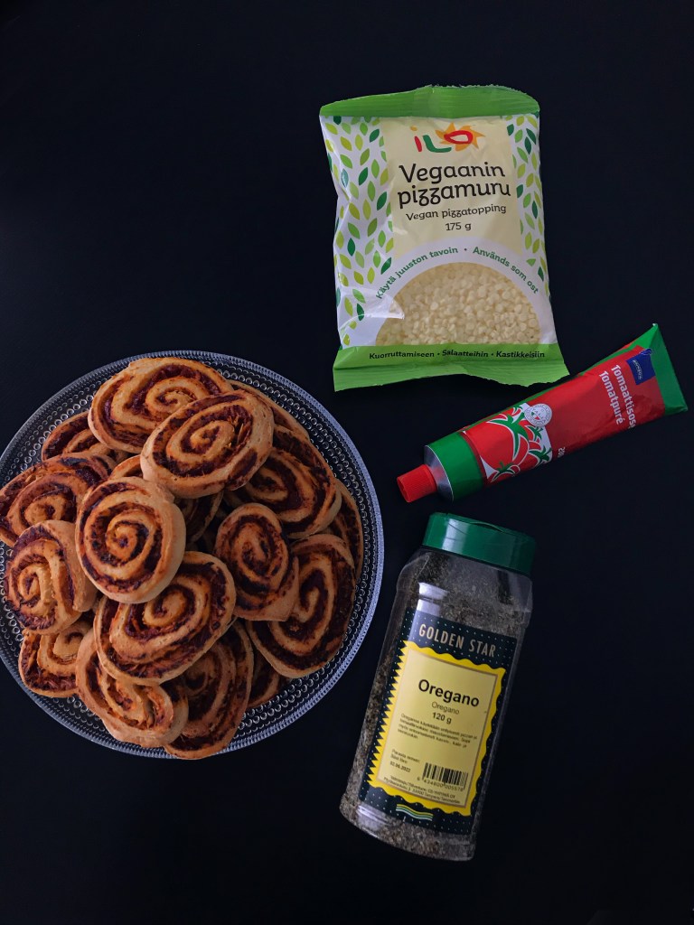 Kaulitse taikina leivinpaperin päällä ohueksi suorakaiteeksi. Levitä pinnalle tomaattisose ja ripottele päälle vegaaninen parmesani sekä oregano. Kääri suorakaide leivinpaperin avulla rullalle ja aseta jääkaappiin lepäämään 15 minuutiksi.