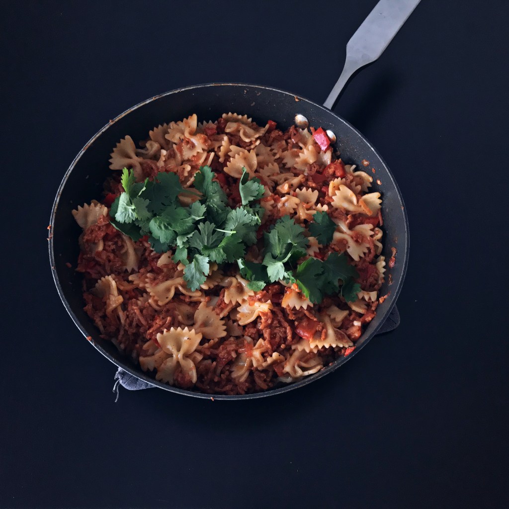 Cajun-pasta sisältää vivahteita Meksikosta; salsaa, korianteria sekä mausteita. Tässä vegaanisessa pastassa proteiinin lähde on Poutun Muu-sarjan kasvisjauhis, jolla huijaa paatuneimmatkin lihansyöjät kasvisruokien äärelle!