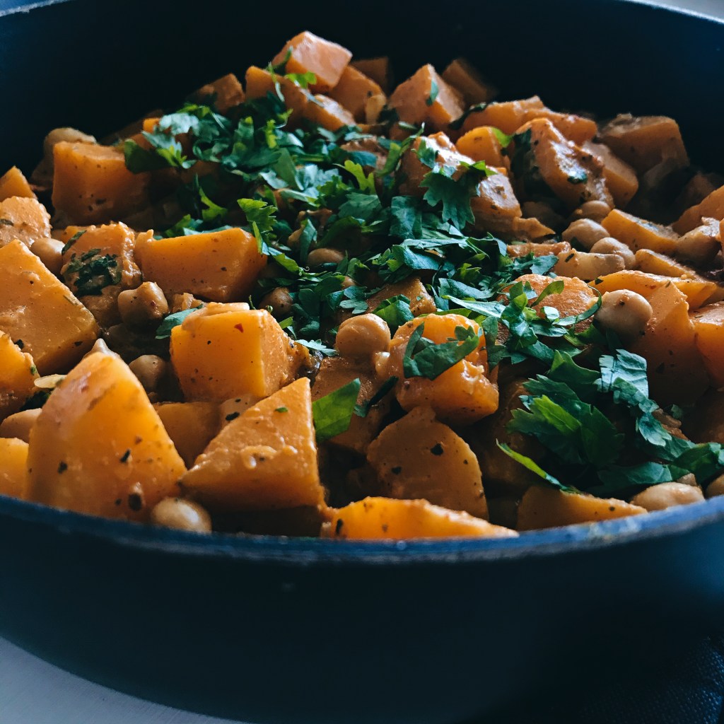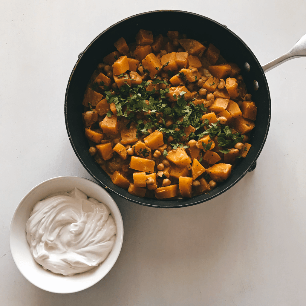 Loman kunniaksi tein pitkästä aikaa currya, joka muuten sopisi hyvin myös Halloweeniin. Myskikurpitsasta ja kikherneistä valmistuu helposti mausteinen ja maukas curry, jonka makuja kookos-jogurttikastike tasapainottaa. Tarjoile curry riisin tai naanleivän kanssa.