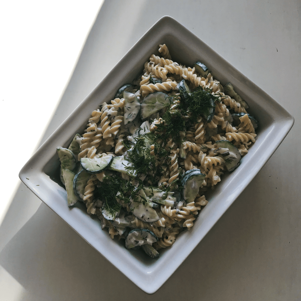 Onko vapun ruoat jo mietinnässä? Vappua vietetään parin viikon päästä ja blogissa on seuraavan kahden viikon ajan luvassa reseptejä, jotka sopivat enemmän tai vähemmän vappuun. Perinteisen perunasalaatin sijasta vappuna voi esimerkiksi kokeilla raikasta kurkku-pastasalaattia, jonka kruunaa herkullinen jogurttikastike sekä tilli.