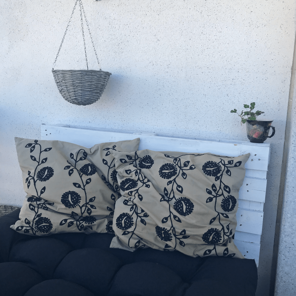 Parvekkeen perältä keskeltä papuja löytyy myös oleskelutila, mistä ei meinannut millään saada kunnon kuvaa! Oleskelutilana toimii kierrätettynä saatu valkoiseksi maalatut eurolavat. Alunperin lavojen mukana tuli myös pitkä patja mutta koska lavat eivät mahtuneet parvekkeelle pitkän sohvan muodossa, patja otettiin vieraspatjaksi ja lavoja on pinottu kolme päällekkäin ja yksi toimii selkänojana. Menee juuri sopivasti kahden istuttavana sohvana! Ostin hiljattain lavalle istuintyynyn ja tällä viikolla selkänojalle on tulossa samaa sarjaa olevat tyynyt. Siihen asti tyynyjen virkaa ovat toimittaneet sohvatyynyt. Amppelissa kasvaa mansikkaa ja selkänojan päällä kupissa kasvaa lisää korianteria.