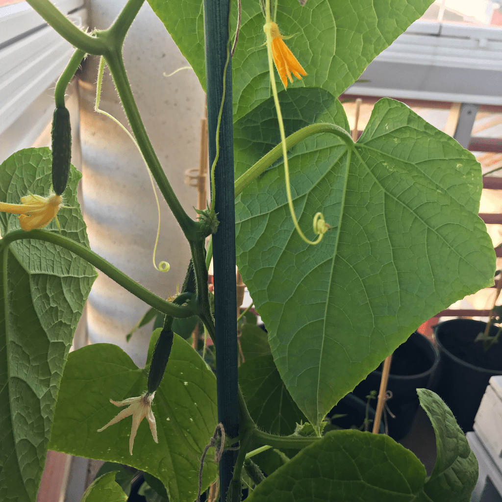 Tänä vuonna kokeilen ensimmäistä kertaa myös kurkun kasvatusta ja lajikkeeksi valikoitu F1, joka on pieni babykurkku. Taimia oli tarkoitus laittaa kolme mutta tällä hetkellä kaksikin kurkkua näyttää tuottavan satoa sen verran, että kokeilin riittäisikö kaksi. Toinen kurkuista on lähes pari metriä pitkä, toinen on vasta taimi, joka istutettiin noin pari viikkoa sitten mutta kasvaa jo kohisten! Kurkun kasvattaminen on osottautunut haasteelliseksi sillä en ymmärtänyt kuinka paljon vettä ja lannoitetta ne tarvitsevatkaan! Satoa näyttäisi kuitenkin olevan luvassa mutta tämä kesä on mennyt hieman opetellessa.