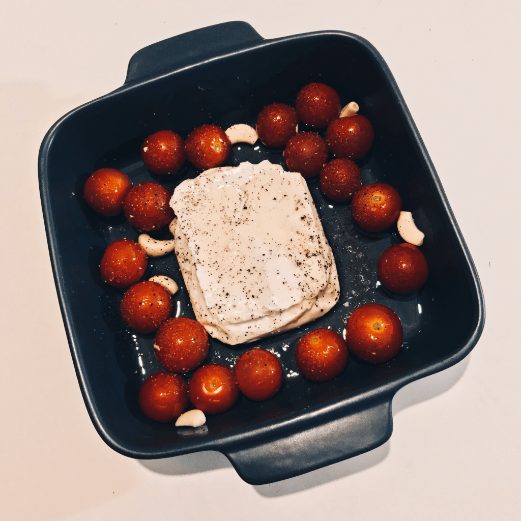 Lorauta osa oliiviöljystä uunivuoan pohjalle. Laita kreikkalainen vuusto kokonaisena uunivuokaan ja lisää joukkoon tomaatit sekä kuoritut valkosipulinkynnet. Kaada loppu oliiviöljy vuuston ja tomaattien päälle. Pyöräytä tomaatit sekä valkosipulin kynnet oliiviöljyssä ja mausta vuoka ripauksella suolaa ja pippuria.