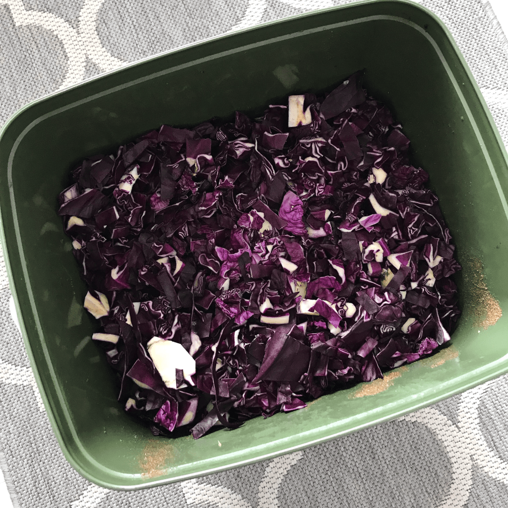 Ennen biojätteiden laittamista bokashiin niitä on hyvä vähän pilkkoa pienimmäksi. Meillä banaanin kuoren leikellään pienemmäksi summanmutikassa saksilla, omenien karat pilkotaan kahteen tai kolmeen osaan ja niin edelleen. Isot palat tai jopa kokonaiset kasvikset tai hedelmät saattavat vain mätääntyä astiassa, joten pilkkominen kannattaa aina. Hienojakoisempi biojäte menee sankoon tiivimmin, eikä ilmarakoja jää niin paljon ja fermentoituminen nopeutuu.