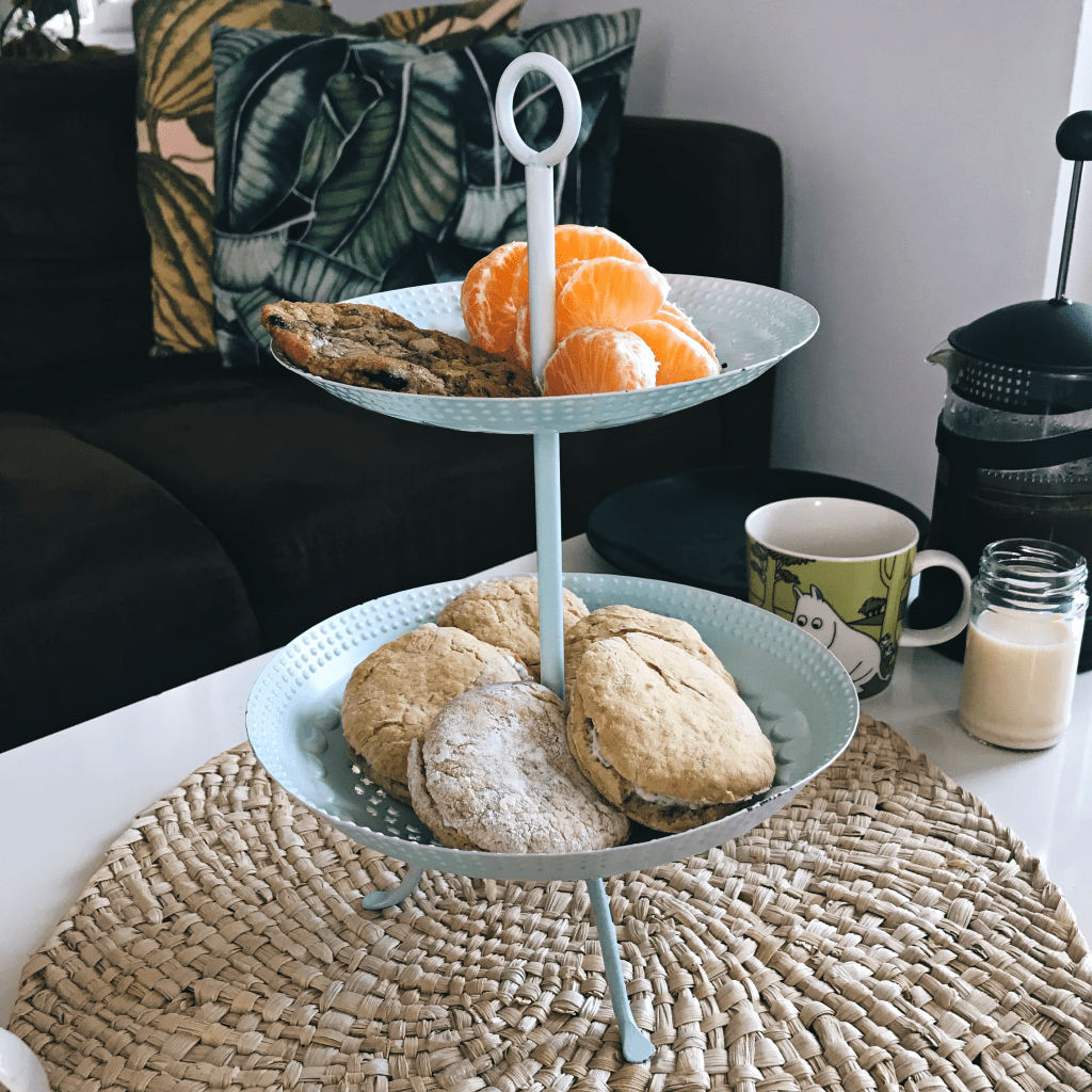 Lomalla tuli hurahdettua Neiti Marpleen aivan täysin ja sen tiimoilta kello viiden tee -ajatukseen. Olemme säännöllisesti pitäneet näitä kello viiden tee- tai kahvihetkiä englantilaiseen tyyliin, jolloin kattauksessa on ollut niin suolaista kuin makeaa vaihtelevasti. Tarjoiluista on löytynyt kurkkuvoileipiä, croissantteja, marjoja, hedelmiä, piirakkaa ja pikkuleipiä sen mukaan mitä on sattunut olemaan kaapissa. Jokaisessa tarjoilussa on kuitenkin ollut skonsseja, jotka ovat niin peri englantilaisia kuin olla ja voi.