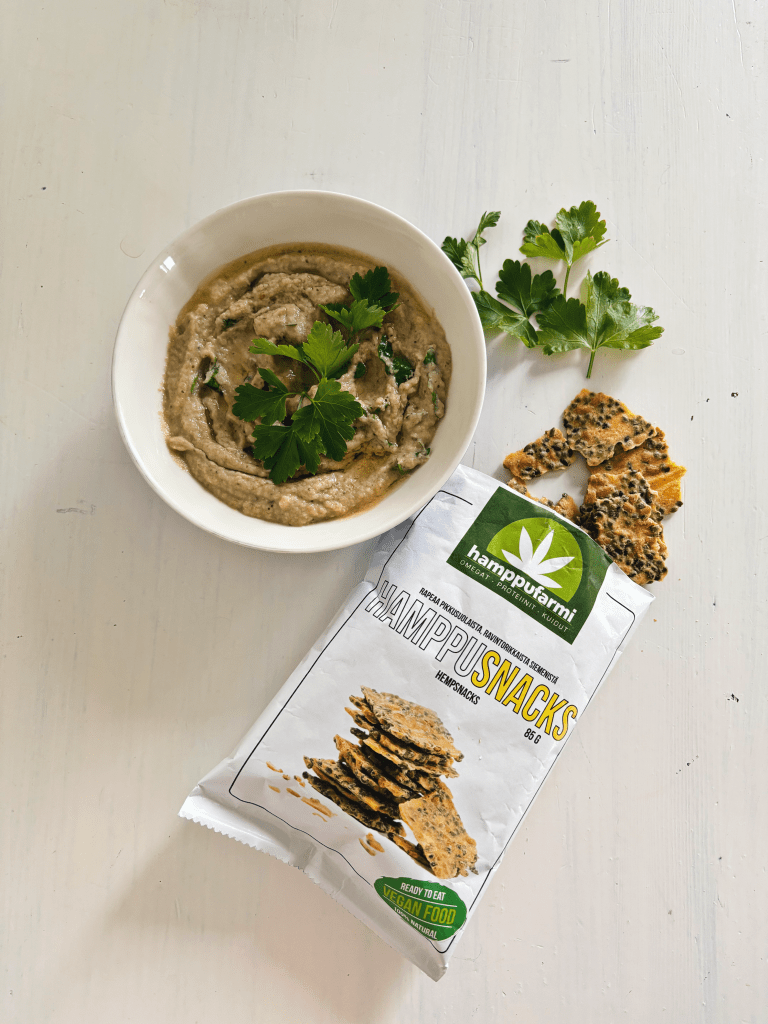 Aloitinkin hamppukokeilut helpoimmasta tuotteesta, eli hamppusnacksista joka on rouskuva pikkusuolainen. Maku oli koukuttava ja snacksit sopivatkin nimenomaan dipin kanssa tai salaatteihin krutongin sijasta. Koska meillä tykätään kaikista kastikkeista, dipeistä sekä dipattavasta, mikä sen parempi idea kun tehdä leffailtaan snacksien kanssa baba ganoush eli libanonilainen munakoisotahna. Dippi sopikin näiden hamppusnacksien kanssa erittäin hyvin ja pussi hupeni hyvinkin nopeasti.