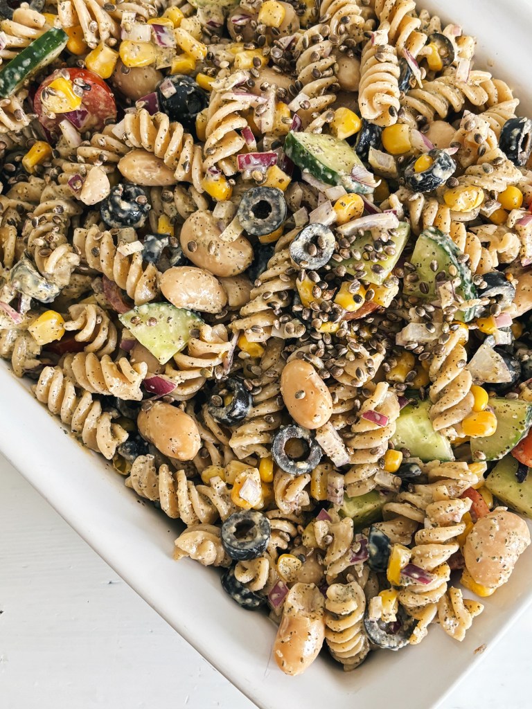 Keitä pasta kypsäksi suolatussa vedessä. Valuta pasta. Hienonna punasipuli sekä tilli, halkaise tomaatit ja kuutio kurkku. Sekoita kaikki vihannekset sekä pasta keskenään isossa kulhossa. Sekoita joukkoon italiaistyylinen salaattikastike tai valmista vaihtoehtoinen kastike sekoittamalla kaikki ainekset yhteen ja sekoita sitten salaatin joukkoon. Ripottele päälle paahdettuja ja suolattuja hampunsiemeniä.