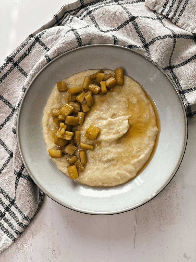 Tarjoile puuro paistetun raparperin kanssa. Lisää päälle halutessasi vielä hieman vaahterasiirappia tai vaniljakastiketta.