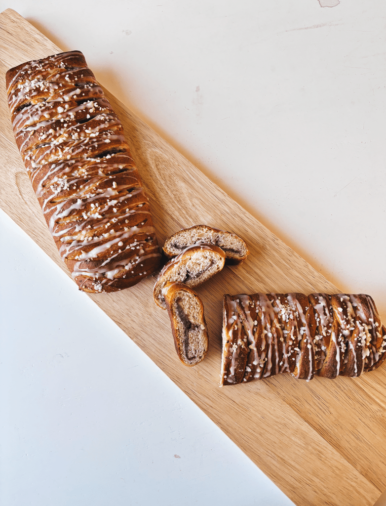 Lämmitä kasvijuoma kädenlämpöiseksi ja sekoita hiiva joukkoon. Sekoita nesteeseen suola, sokeri, kardemumma, karvasmanteliaromi sekä mantelijauhe. Lisää vehnäjauhoja vähän kerrallaan vaivaten taikinaa. Lisää vaivauksen loppupuolella rasva sekä loput vehnäjauhot ja vaivaa kimmoissaksi taikinaksi. Kohota taikina lämpimässä vedottomassa paikassa liinan alla kaksinkertaiseksi.